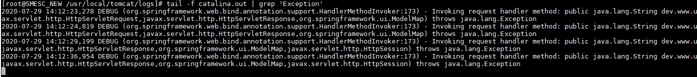 위와같이 명령어를 작성하면 'Exception'이란 단어가 들어간 로그만 실시간으로 확인할 수 있다.