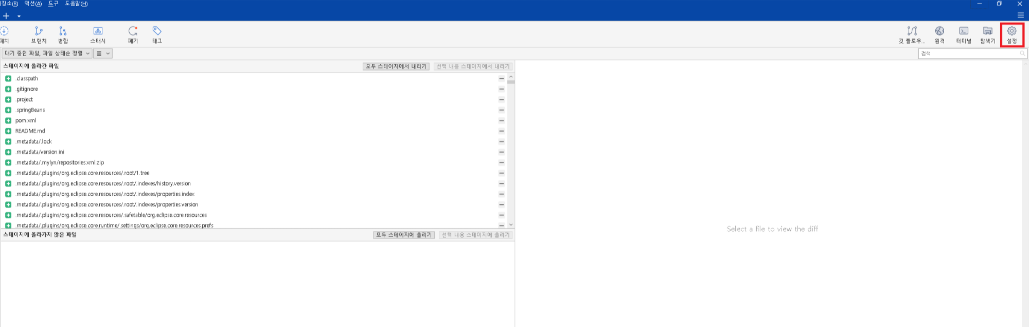1. 해당 소스트리에서 우측의 설정을 클릭해준다.