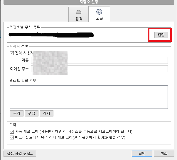 4. 편집을 누르면 편집을 할 수 있는 텍스트 에디터가 열리는데 거기에 제외해야 할 파일/폴더 하위 경로 등을 입력해준다.