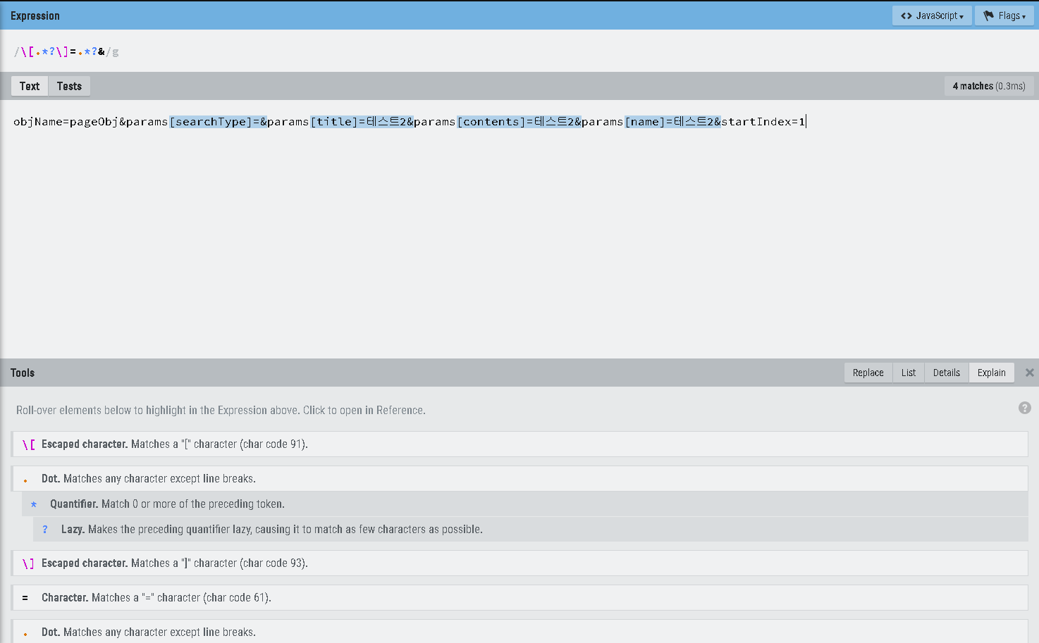 정규식을 아직 많이 몰라 저 정규식을 만들려고 정규식 테스트 사이트에서 테스트하여 적용을 하였다.
