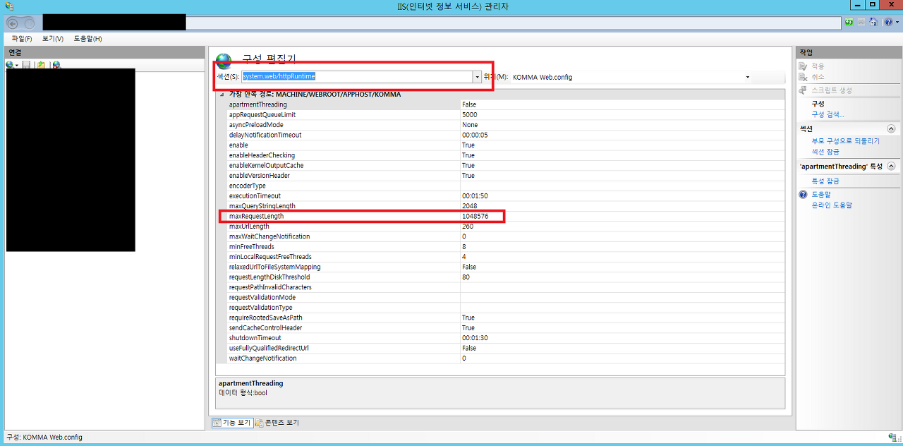 IIS서버 관리자 -> 해당 사이트 클릭 -> 관리 탭에서 구성 편집기를 클릭한다.
